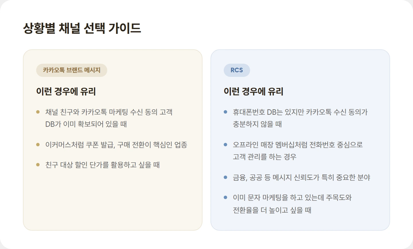 가장 이상적인 방법은 두 채널을 병행하는 것입니다. 카카오톡 채널 친구에게는 브랜드 메시지로, 전화번호만 확보된 고객에게는 RCS로 같은 캠페인을 분기 발송하면 도달률과 전환율을 동시에 높일 수 있죠.